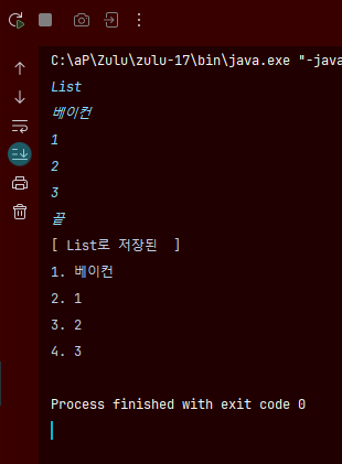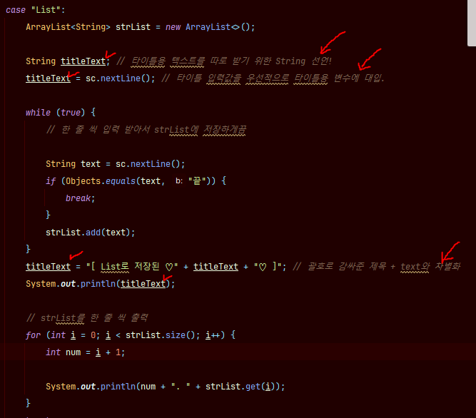 ArrayList를 선언해주고 while문으로 입력값을 받다가, 마무리로 “끝” 을 입력하면 break로 반복을 멈추도록 if문을 활용한다.