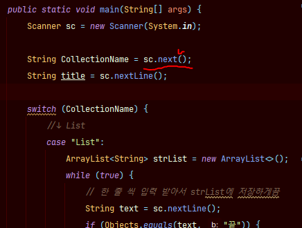 List, Map, Set문 중 선택 입력을 받기위한 CollectionName 한 줄,