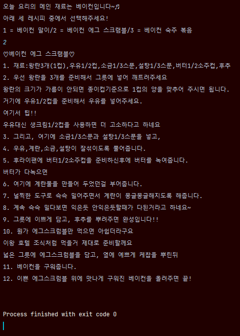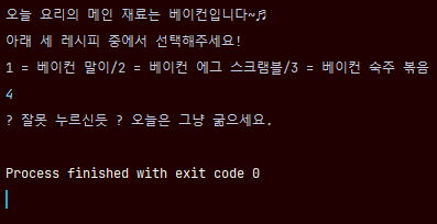 System.out.println("1 = 베이컨 말이/2 = 베이컨 에그 스크램블/3 = 베이컨 숙주 볶음");