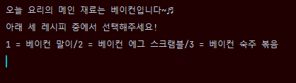 터미널에서 입력 받기 전 먼저 안내 메세지를 출력하도록 했다. (1,2,3 번 레시피 중에서 선택하도록)